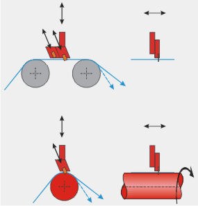 Der Schnitt kann dabei frei in der Warenbahn erfolgen, wobei diese möglichst kurz vor und nach der Schneidstelle von Umlenkwalzen unterstützt werden sollte, um ein Ausweichen des Materials beim Schneiden zu vermeiden. Oder der Schnitt erfolgt in einer Nutwelle, die sich unterhalb der Warenbahn befindet, um die Bahn zu stützen. Bei kontinuierlich laufenden Maschinen können Doppel- oder Mehrfach-Klingenhalter eingesetzt werden, um ein Produktionsstopp zum Tausch der Klingen bei Verschleiß zu vermeiden.